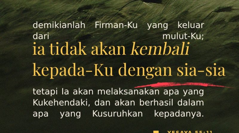 我口所出的話也必如此,決不徒然返回,卻要成就我所喜悅的,在我發他去成就(發他去成就:或譯所命定)的事上必然亨通。賽55:11 神口中所發出的話語帶著能力,並且絕不會徒然返回,必定成就祂所定的旨意。我們可以從創造的記載中看到這一點:神所說出的話,就成就了祂所說的事。神說:「要有光」,就有了光。這表明神的話語是活的,並且本身就帶著能力。 《約翰福音》向我們揭示了這話語的奧秘:耶穌就是那道(話)。太初有道,道與神同在,道就是神(約1:1)。耶穌基督作為這道,成就了父所吩咐的一切,而父也保證祂所吩咐的必然完成。 讓我們傳揚這有生命、有能力的話語,願我們每一次的宣講都以基督為中心,就是那成了肉身的道。#tw Firman Tuhan yang keluar dari mulut Tuhan mempunyai kuasa dan tidak pernah akan gagal mencapai tujuan