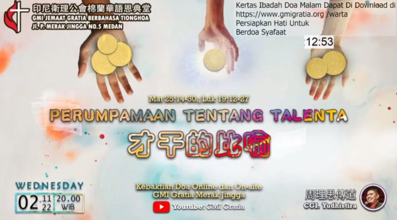 崇拜 Kebaktian 晚禱會 Kebaktian Doa Malam 財干的比喻 Perumpamaan tentang Talenta November 2, 2022November 19, 2022 admin 371 Views