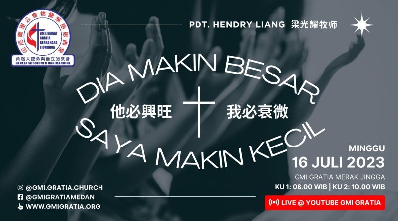 主日崇拜 Kebaktian Umum 祂比興旺,我比衰微 Dia makin besar,saya makin kecil July 15, 2023July 26, 2023 admin 330 Views